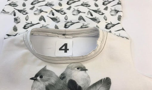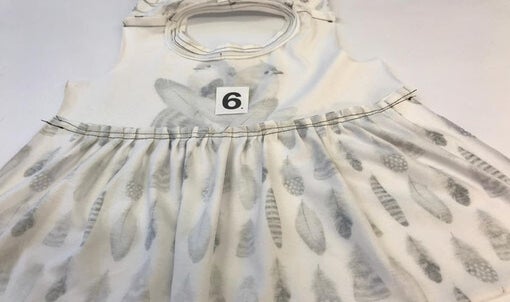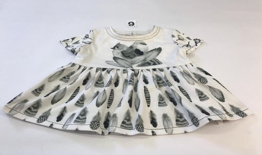 Dit keer hebben we als variatie het jurkje van patroon Giullia. Een heerlijk jurkje voor de zomer met een rimpelrokje. Op dit superleuke paneel van Stenzo stoffen staan ook nog een leuk kussentje en we gebruikte de veertjes voor op het mutsje in plaats van de strik.
